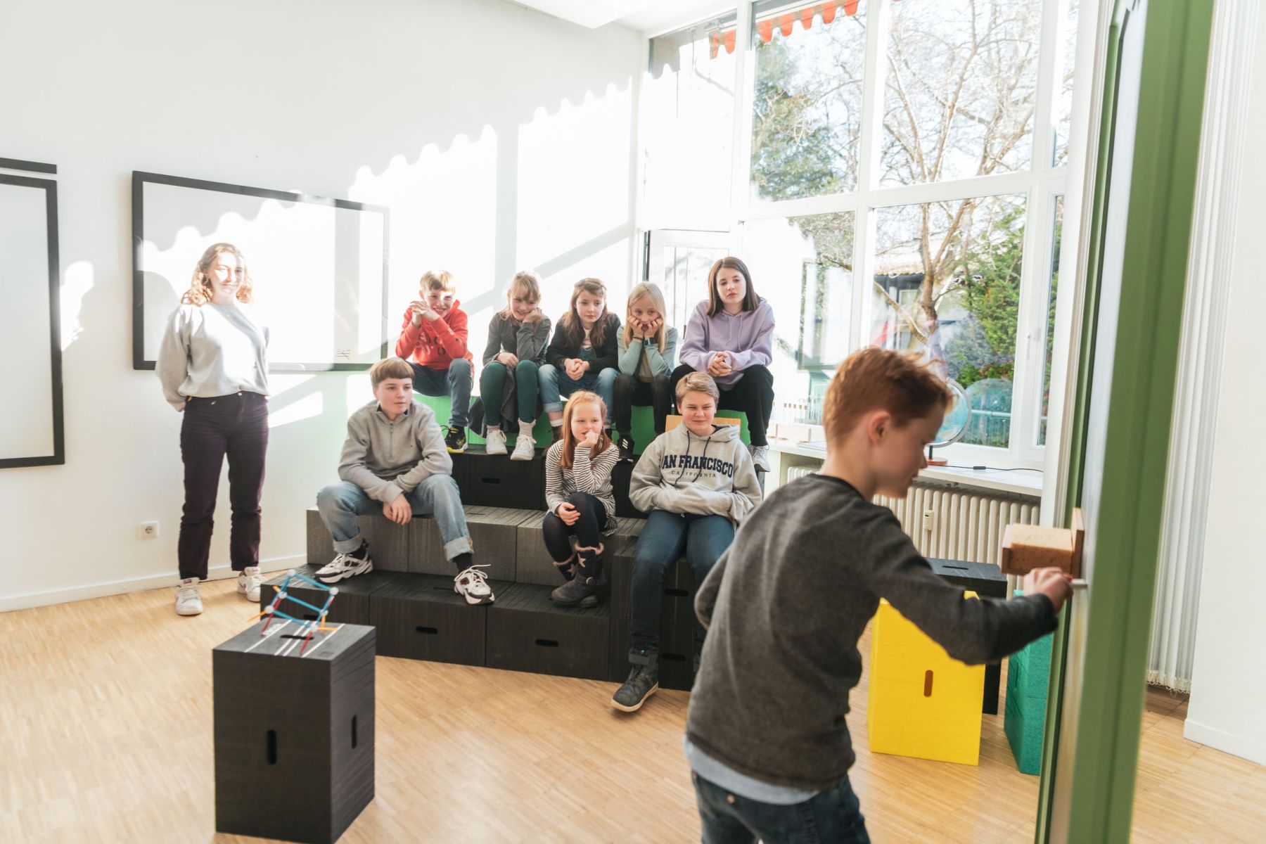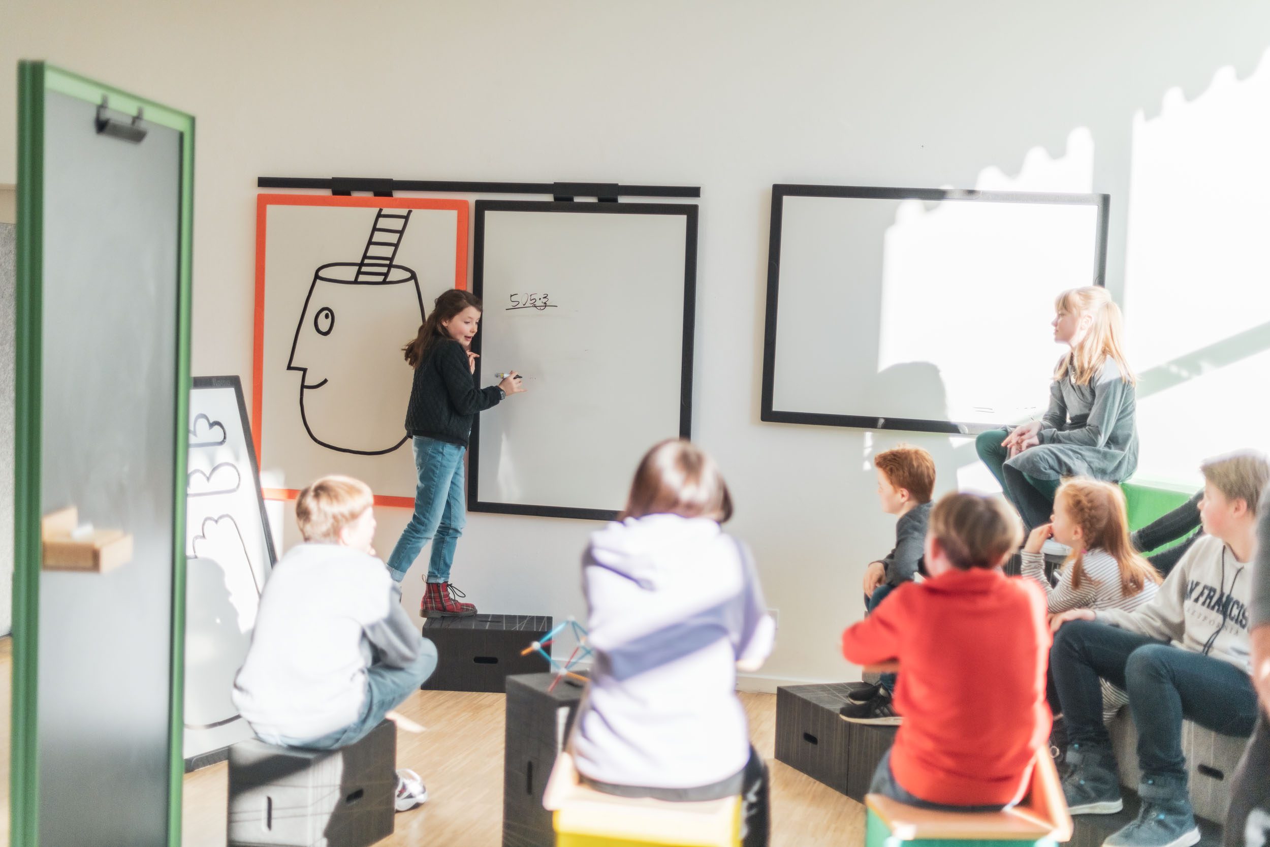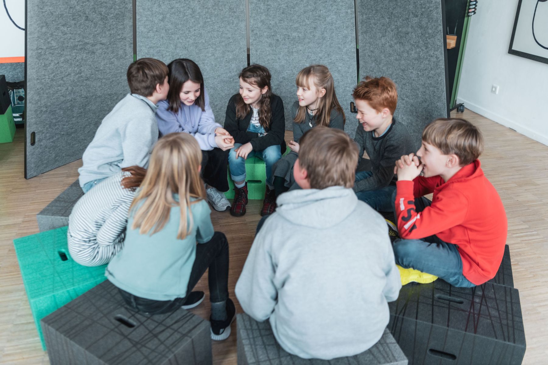 In der Schule im Lernflur, im flexiblen Klassenzimmer, Ganztagsräume oder im Sitzkreis.